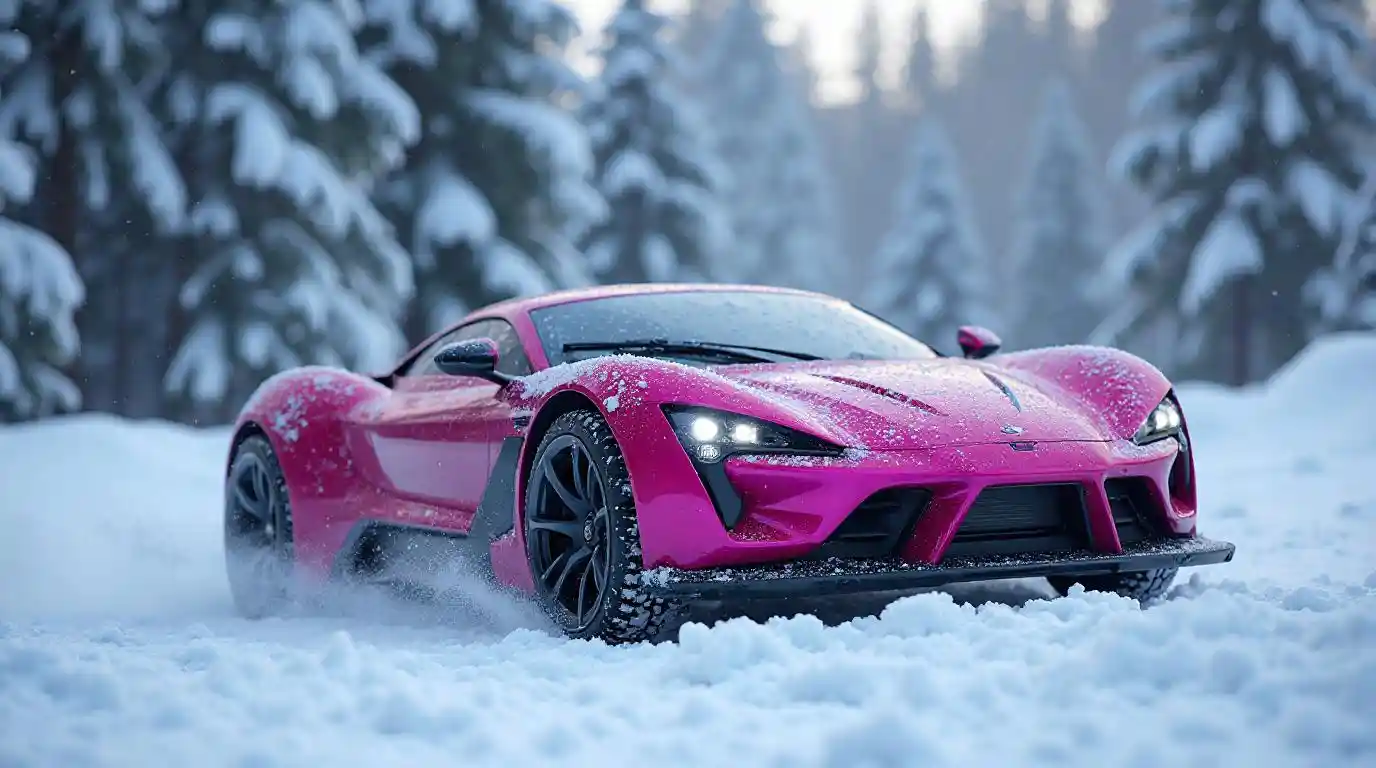 MichaelA Magenta futuristic car driving on snow, Christmas