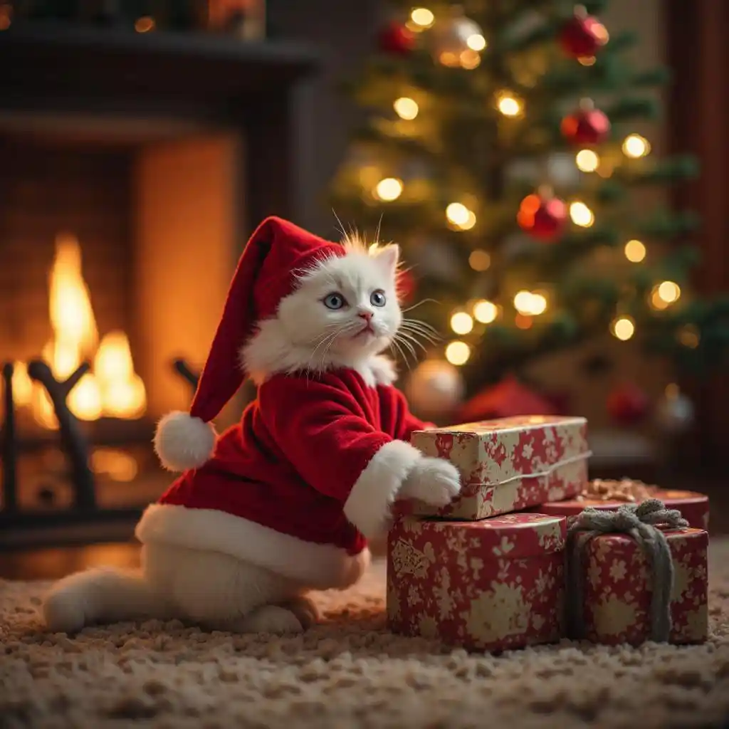 HudsonA fluffy white kitten dressed in a Santa outfit with a red hat and white trim, placing gifts under a beautifully lit Christmas tree near a cozy fireplace.
