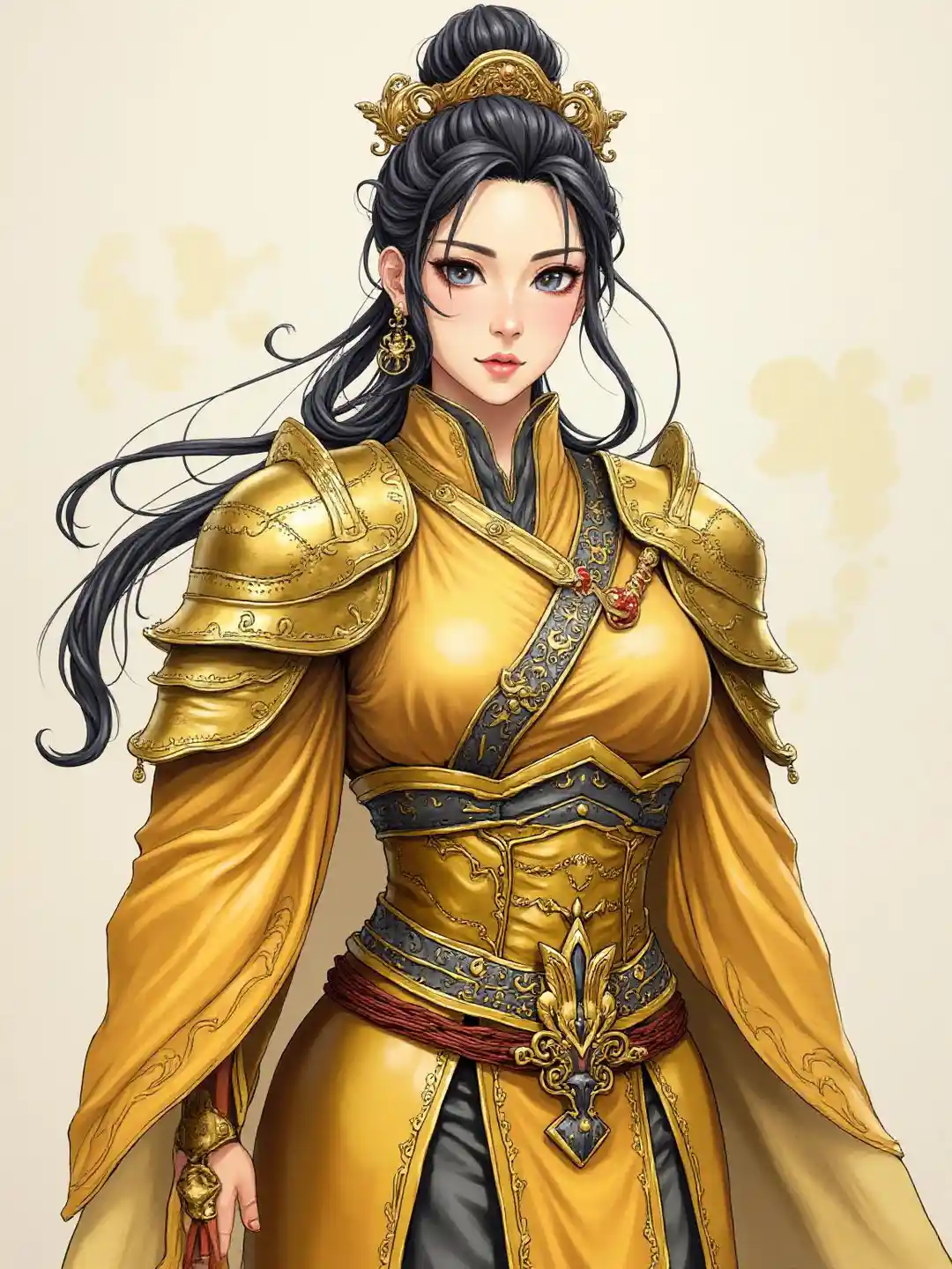 Evelynck-mgs战术美学融合nistyle日式赛璐璐风格,in special ink painting mode, showing that Chun Li is wearing a gold holy coat,and intricate lines intertwine muscle curves and armor