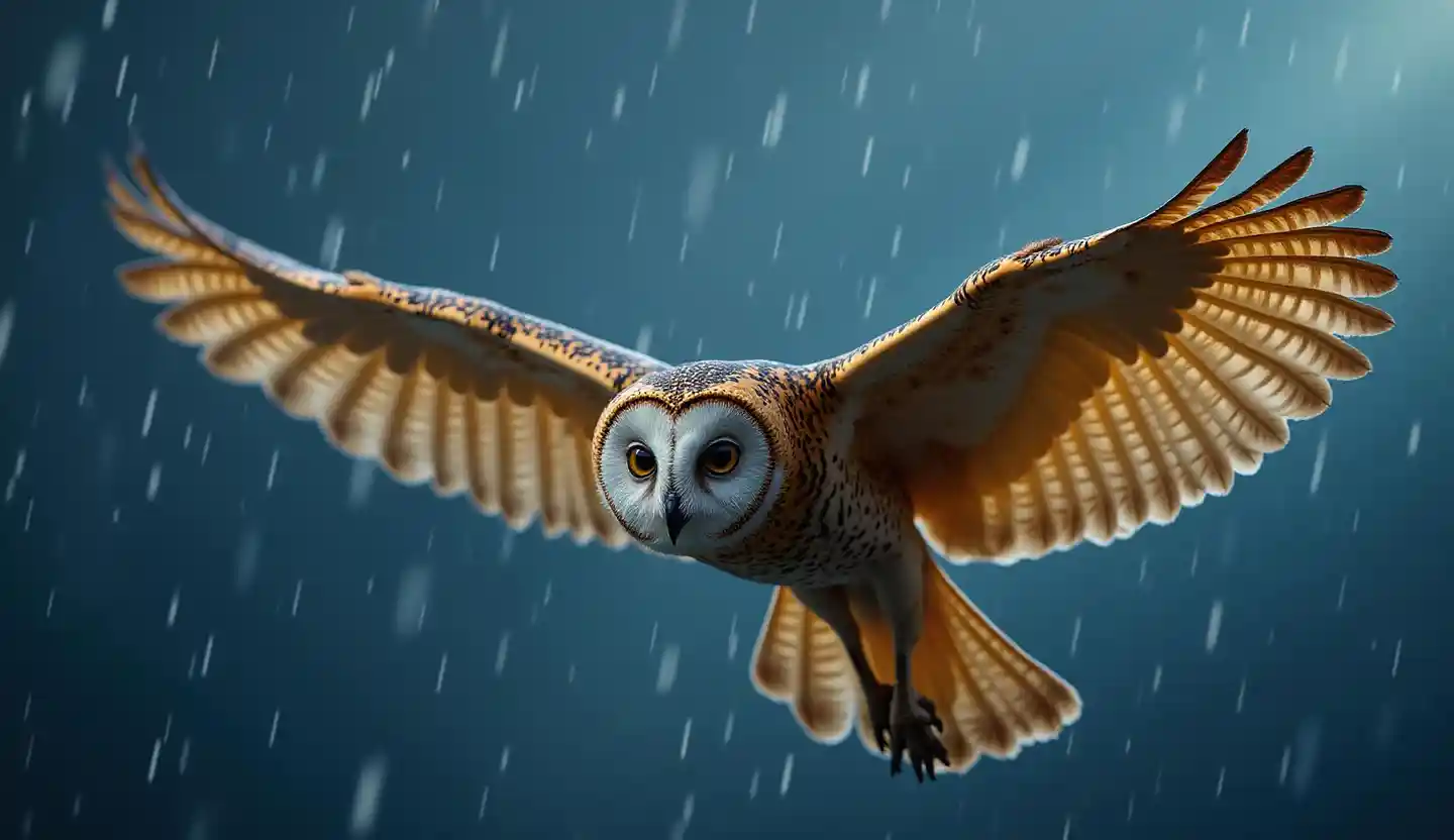 NathanBlue sky, gold owl, Very cinematic, a gold barn owl, flying through a rainstorm, detailed feathers, piercing eyes, sharp talons, outstretched wings, dynamic pos