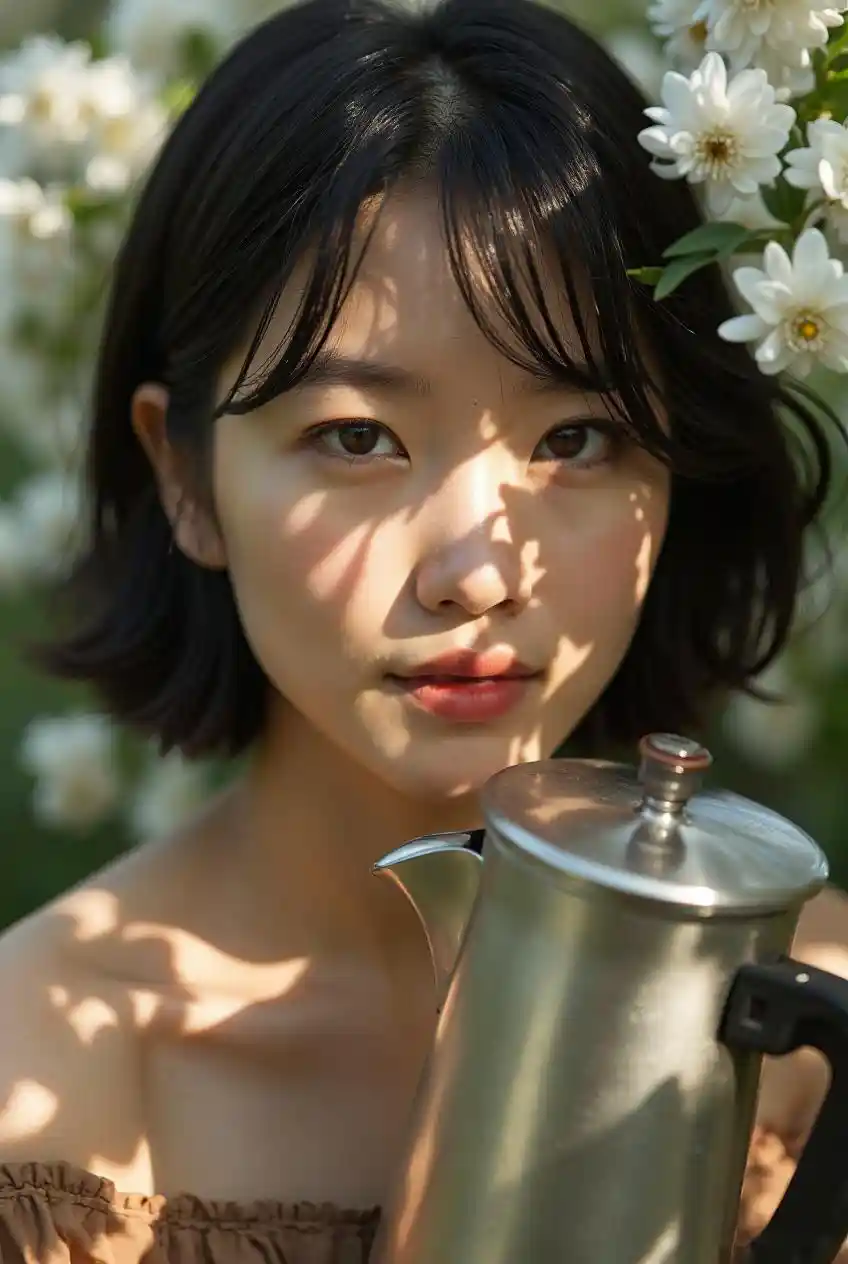 A beautiful Japanese woman holding an antique coffee pot, with sunlight shining through the leaves of white flowers on her face. The photo was taken by photographer Mika Aero and has a cinematic feel. It is a portrait shot. She wears brown . Her hair flows in short, straight, black hair. A close-up shot of her eyes, in focus, high resolution, natural lighting, sharpness, bokeh effect, depth of field, fine details, high quality, in the style of Fujifilm velvet.