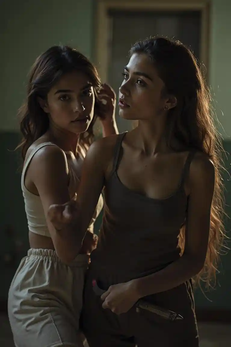 KingstonAmerican shot, high angle shot, the shot is slightly tilted, frontal view, cinematic lighting, ((dynamic pose)), 2 girls, ((((white cell u-1146 has her knife in