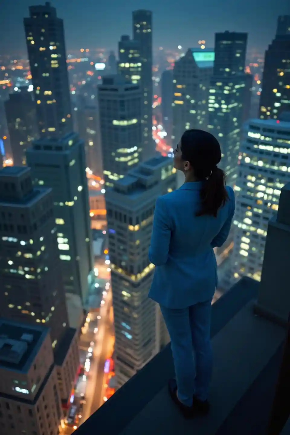 Night in the city center with lots of tall buildings,Woman wearing a light blue suit, white shirt, and black shoes looking down from the top of the tallest buil