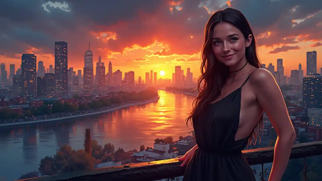 digital painting of a city skyline with a woman (black dress) standing and smiling and a river in the background at night time with a bright orange sky reflecting on the water , art photography, at night, high resolution , realism , beautiful sunset