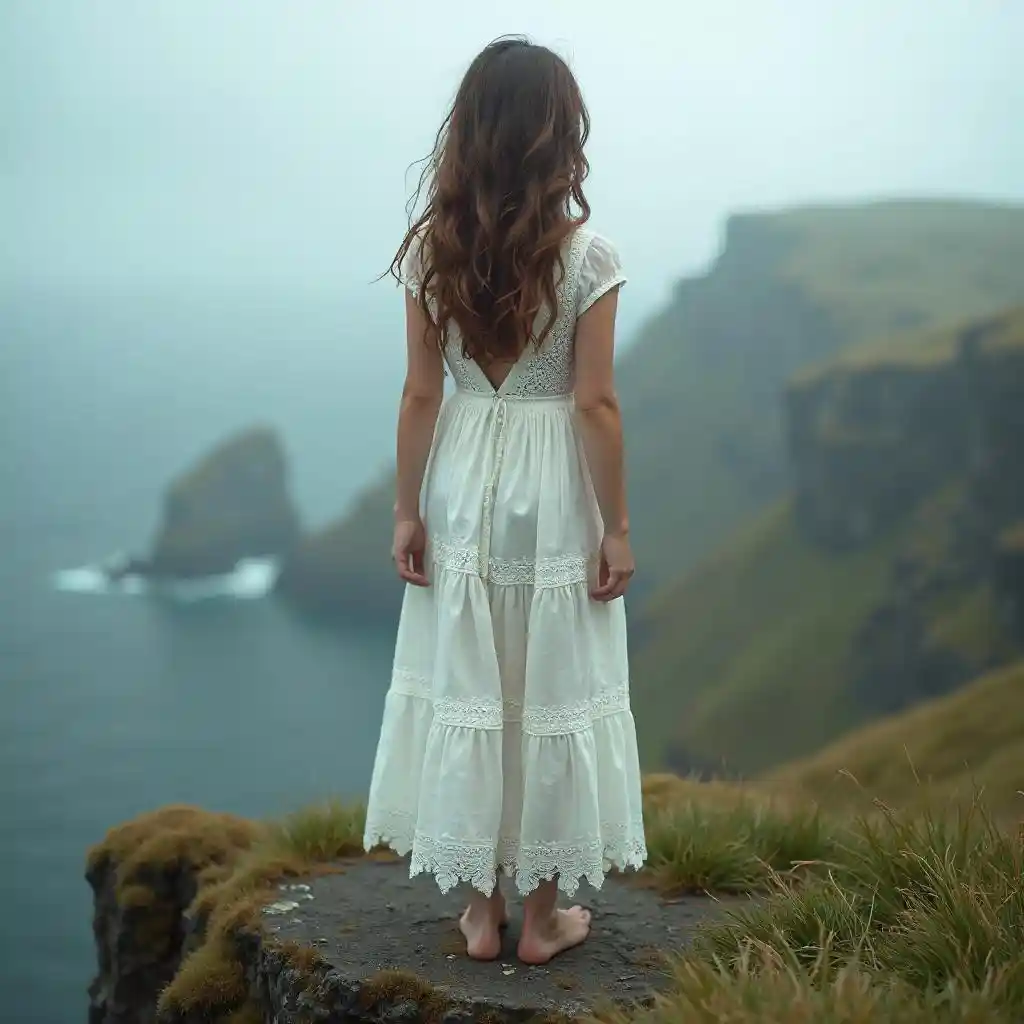 Maverickcreate a photo of a girl on the edge of a cliff, in a white lace floor-length dress without shoes dark brown hair, blue eyes, pale skin, freckles cloudy weather, misty grass yellow-green