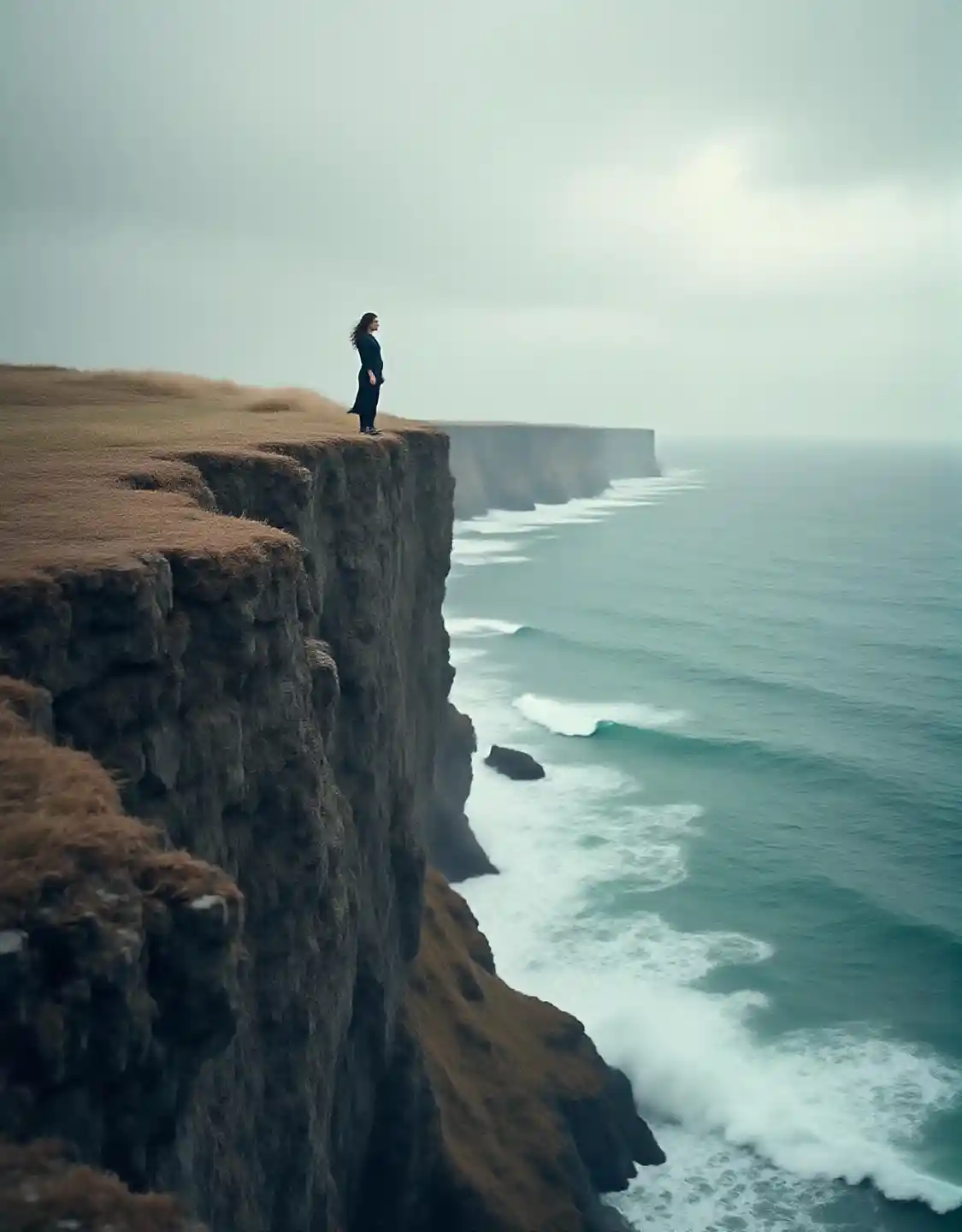 JocelynAn image of a woman standing on the very edge of a sheer cliff and anxiously looking into the distance, the wind blows from the sea, a strong wind blows, ruffle