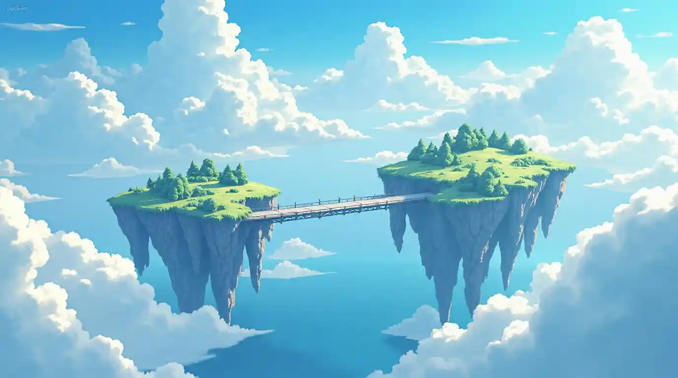 Ethereal realm with floating islands, bridges connecting clouds, mirroring dreamy anime visuals.
