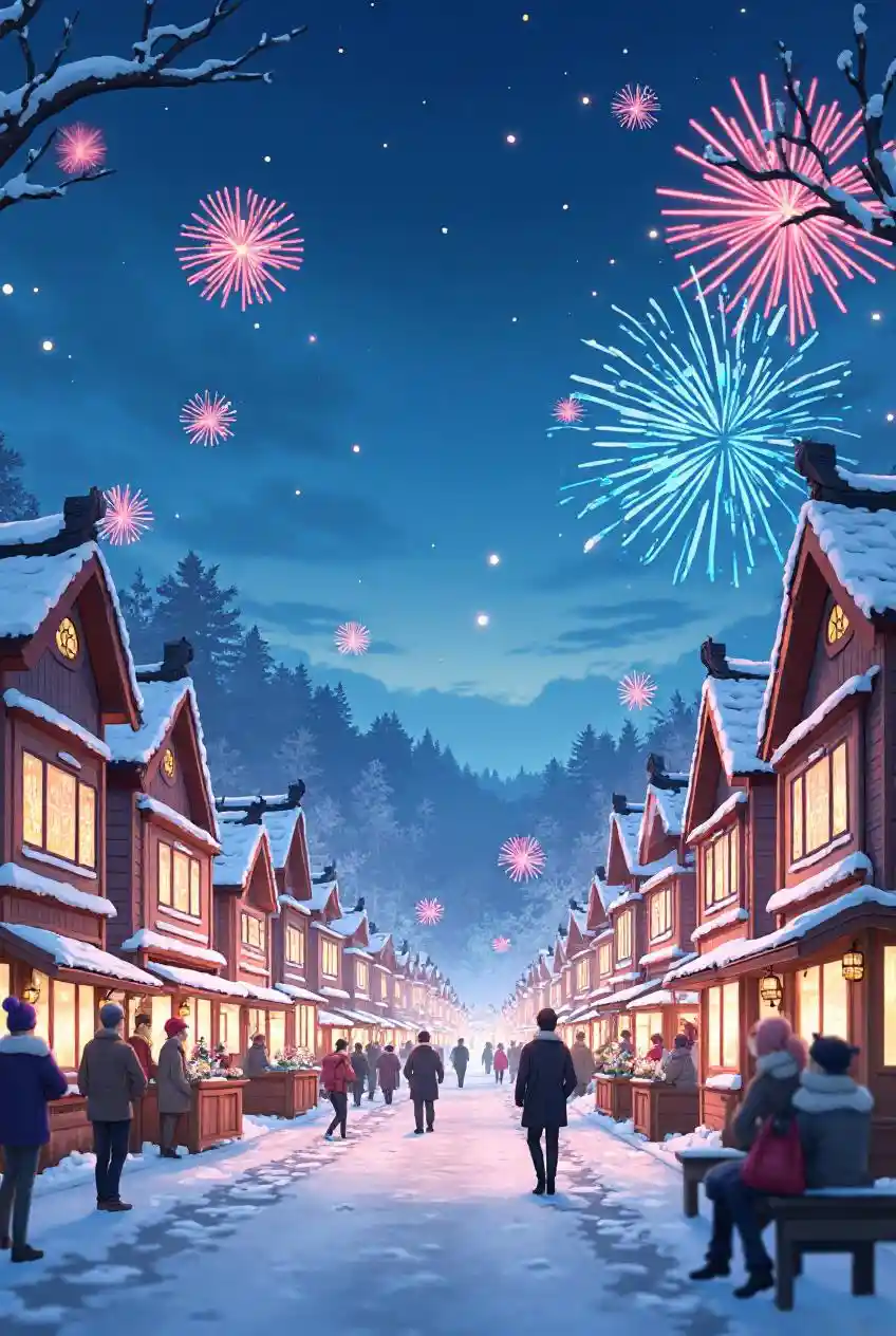 Winter festival in a coastal town, fireworks and dragon parades, in a festive anime style.