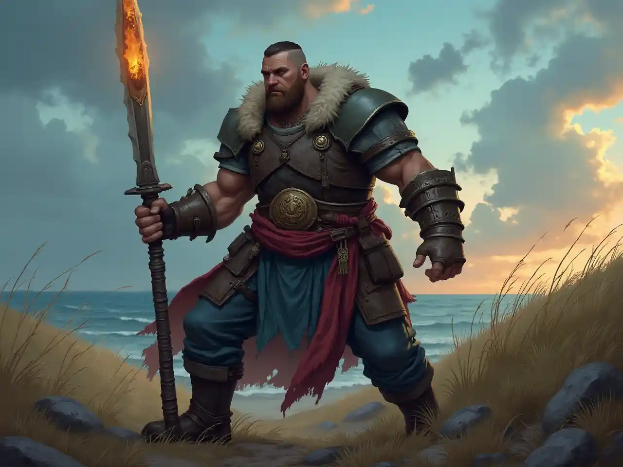 Male heavy-set fit fat large 38-year old hunky seer with short-cut hair and beard, holding magic fantasy-weapon, on a windy coastal field at dusk, pathfinder, d&d setting, enhanced shadow quality