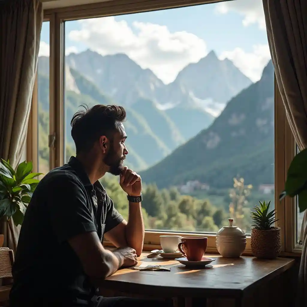 A man with a coffee on a table in his apartment thinking and look8ng to the mountains and the beautiful nature from the window