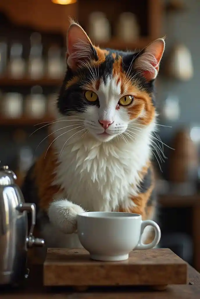 Calico Cat in Coffee Shop Photorealistic Portrait