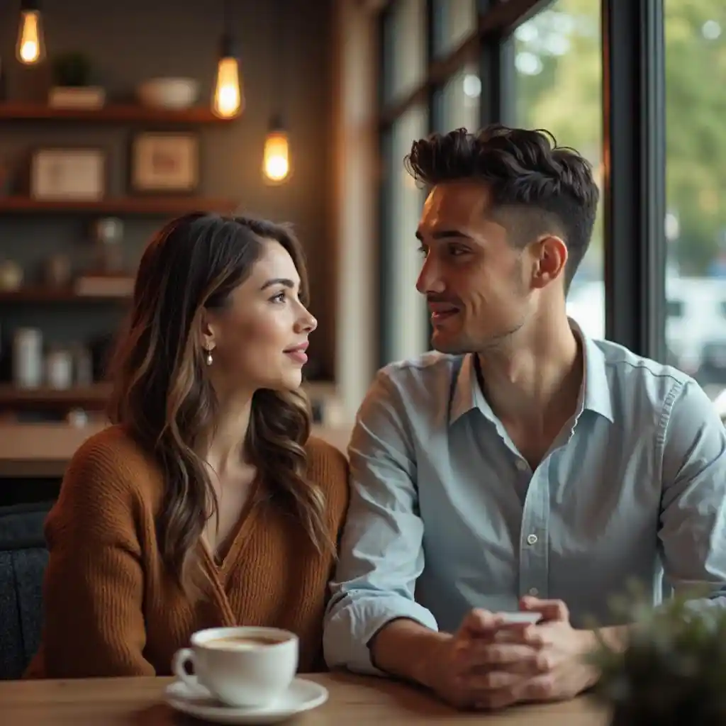 A beautiful girl sitting in a coffe shop and a young man looking at her eyes with grace