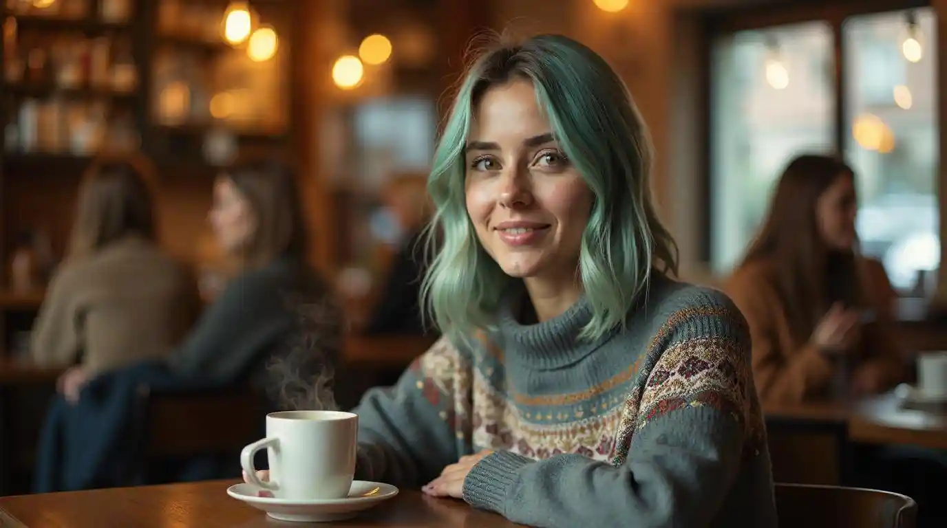 in autumn, a full body shot, a beautiful woman sitting in a coffee cozy English coffee shop, hands on a tall coffee cup with steam rising from it, cute, sweet, shoulder length teal hair, wide shot candid, surrounded by beautiful women in the background, calm expression, wearing a pretty decorated jumper, film grain, Candid, dynamic angle,