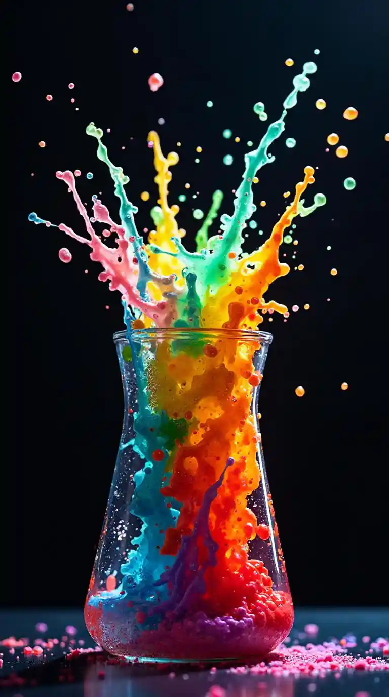 Create an image of a vibrant, multicolored liquid splash that resembles a dynamic and artistic explosion of colors, emerging from a clear glass beaker. The liquid should display a spectrum of colors ranging from red, orange, yellow, green, blue to purple with droplets suspended in mid-air against a dark background. Include the effect of light reflecting through the splashing liquid to enhance the three-dimensional feel and vividness of the colors.
