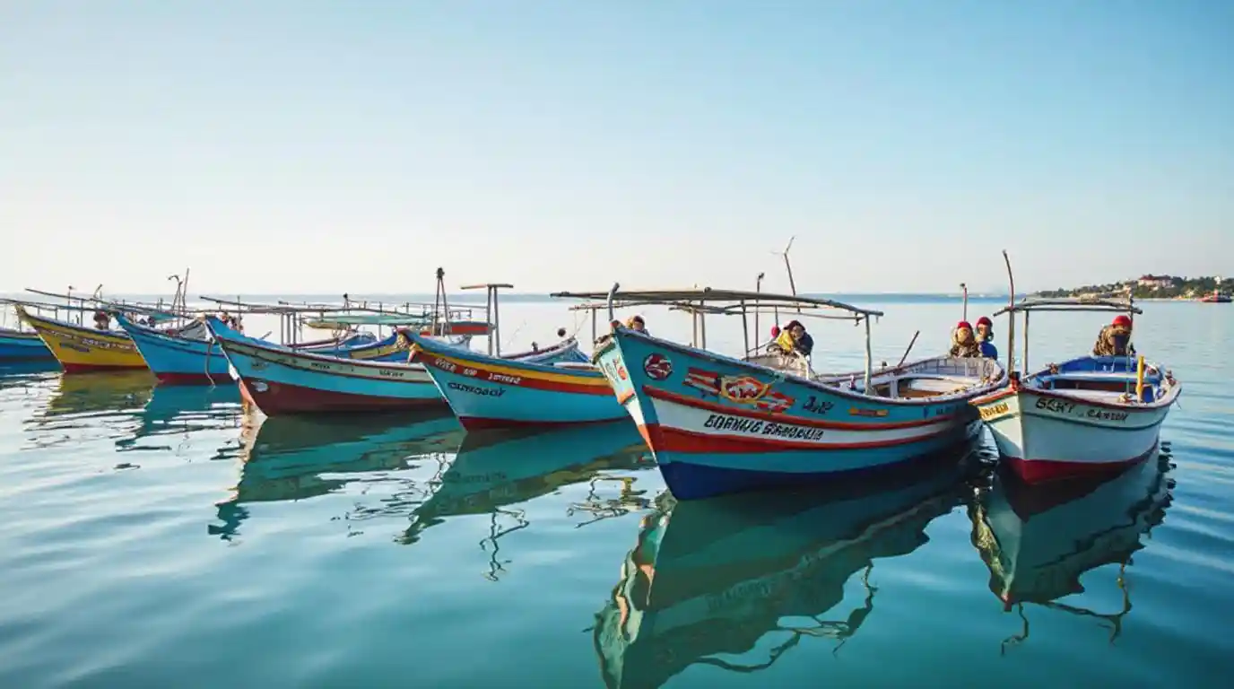 A tranquil bay with colorful fishing boats anchored, their reflections mirrored in the still water.