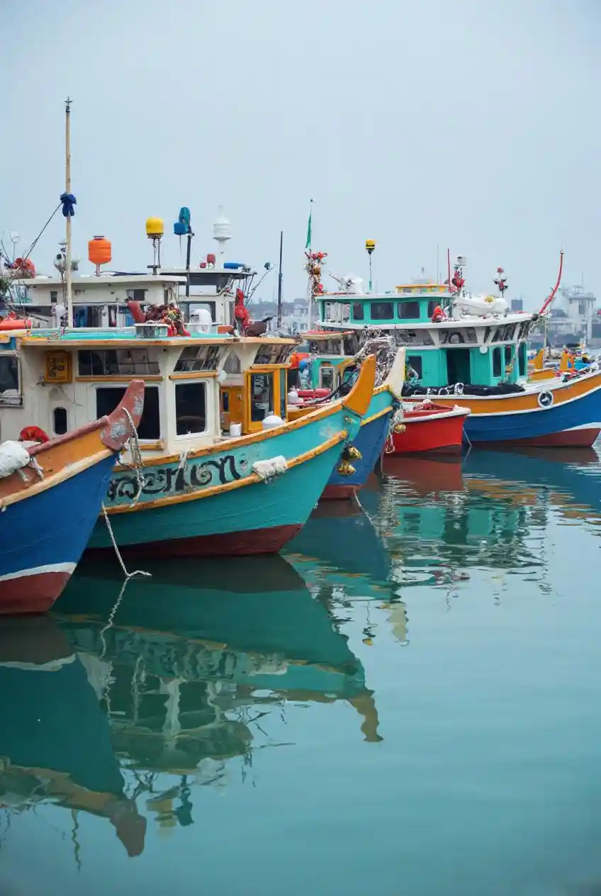 A tranquil bay with colorful fishing boats anchored, their reflections mirrored in the still water.