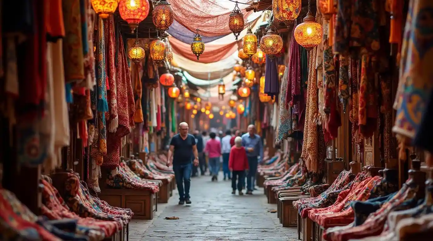 A bustling souk in Marrakech, with tapestries and lanterns creating a riot of colors.