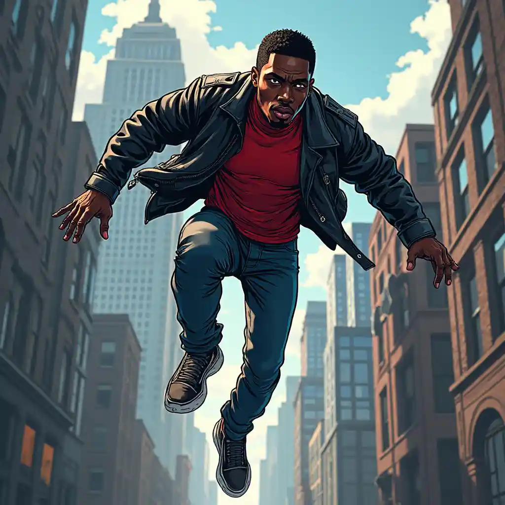 A young black man wearing a black leather jacket and red spandex shirt underneath, with blue jeans and sneakers, flying through the air over buildings in comic book style, american modern comic book art style, cinematic lighting, dynamic style, intense, extreme textures, full details, in 4k