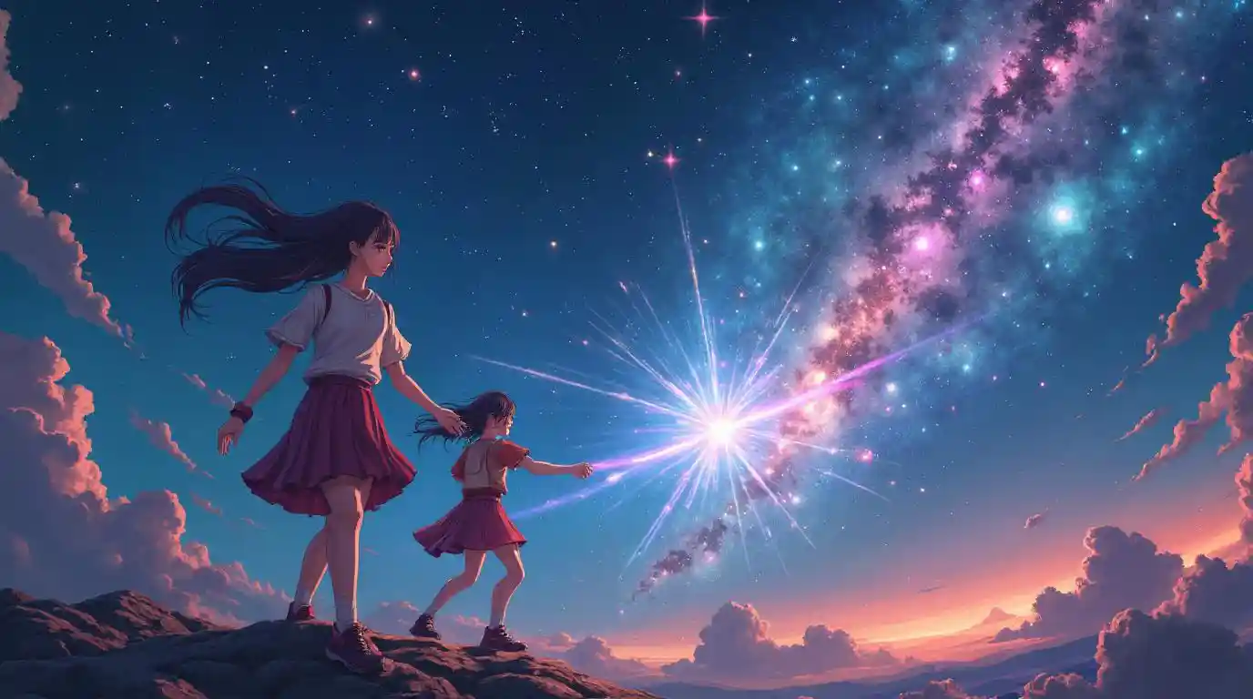 MiaBustling academy in a meteor, students harnessing star magic, resonating with cosmic anime themes.