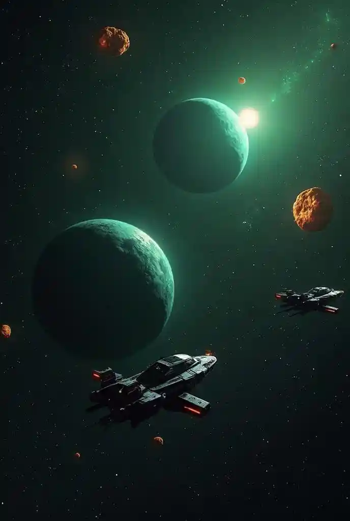 towards a binary star with an emerald colored giant planet and an orange asteroid3spaceships are advancing。The background is a jet black universe where、countles