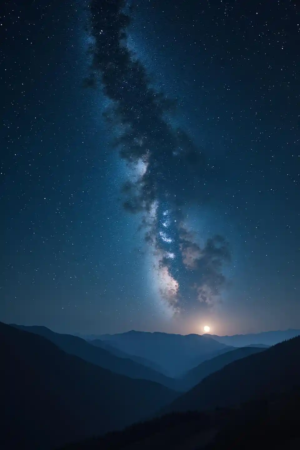 starry night sky, galaxy, nebula, twinkling stars, moonlight, silhouetted mountains, serene landscape, atmospheric lighting, dramatic composition, cinematic ton