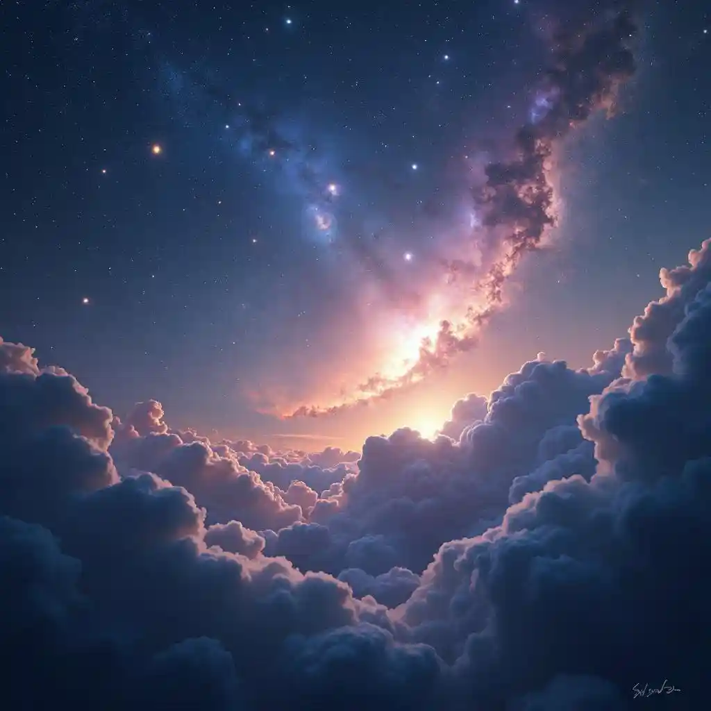 A boundless, mystical expanse of the cosmos unfolds, where galaxies glow softly in deep indigo, violet, and molten gold, their forms gently veiled by a serene, otherworldly mist. In the foreground, an ethereal nebula drifts like a celestial shroud, its luminous clouds of gas and stardust blending seamlessly into the infinite void. Stars flicker faintly, their soft, rhythmic pulses resonating with the ancient heartbeat of the universe. In the distance, a radiant supernova casts a diffuse, sacred glow, illuminating the surrounding void and hinting at cosmic renewal. Subtle waves of translucent light ripple gently through the scene, evoking a sense of peaceful expansion and timeless stillness. The song title, 'Expanding Universe', emerges delicately from the mist, written in a soft, glowing font that blends harmoniously with the celestial backdrop, enhancing the meditative and mystical atmosphere.