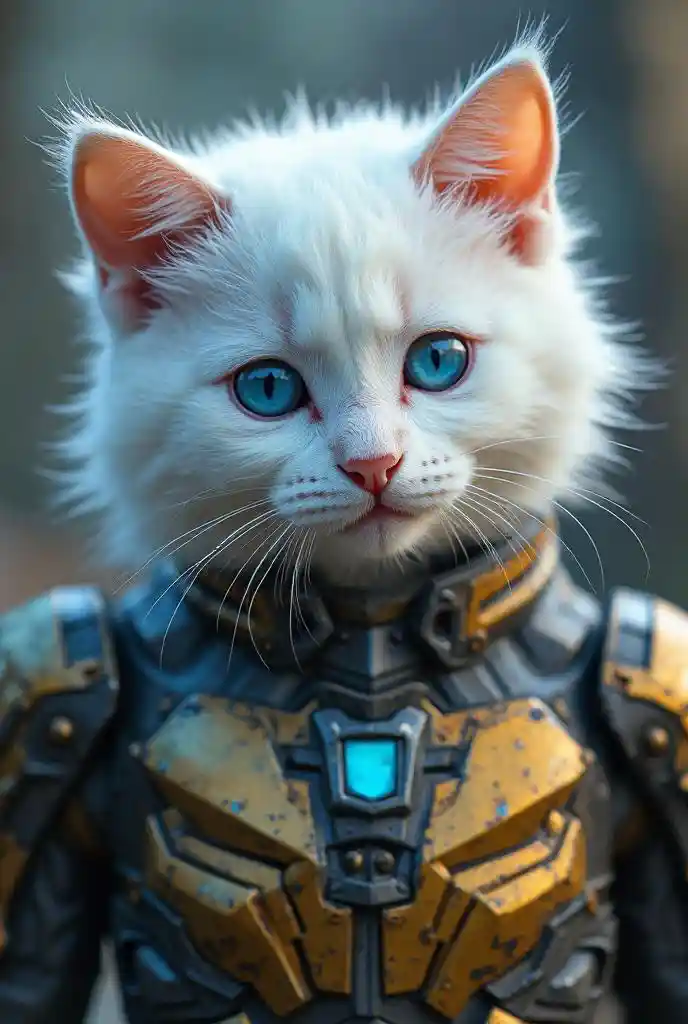 ScarlettA male cat with pure white fur and bright blue eyes, create attractive effects. he is'I'm wearing a nice Transformers costume,., is a combination of white a
