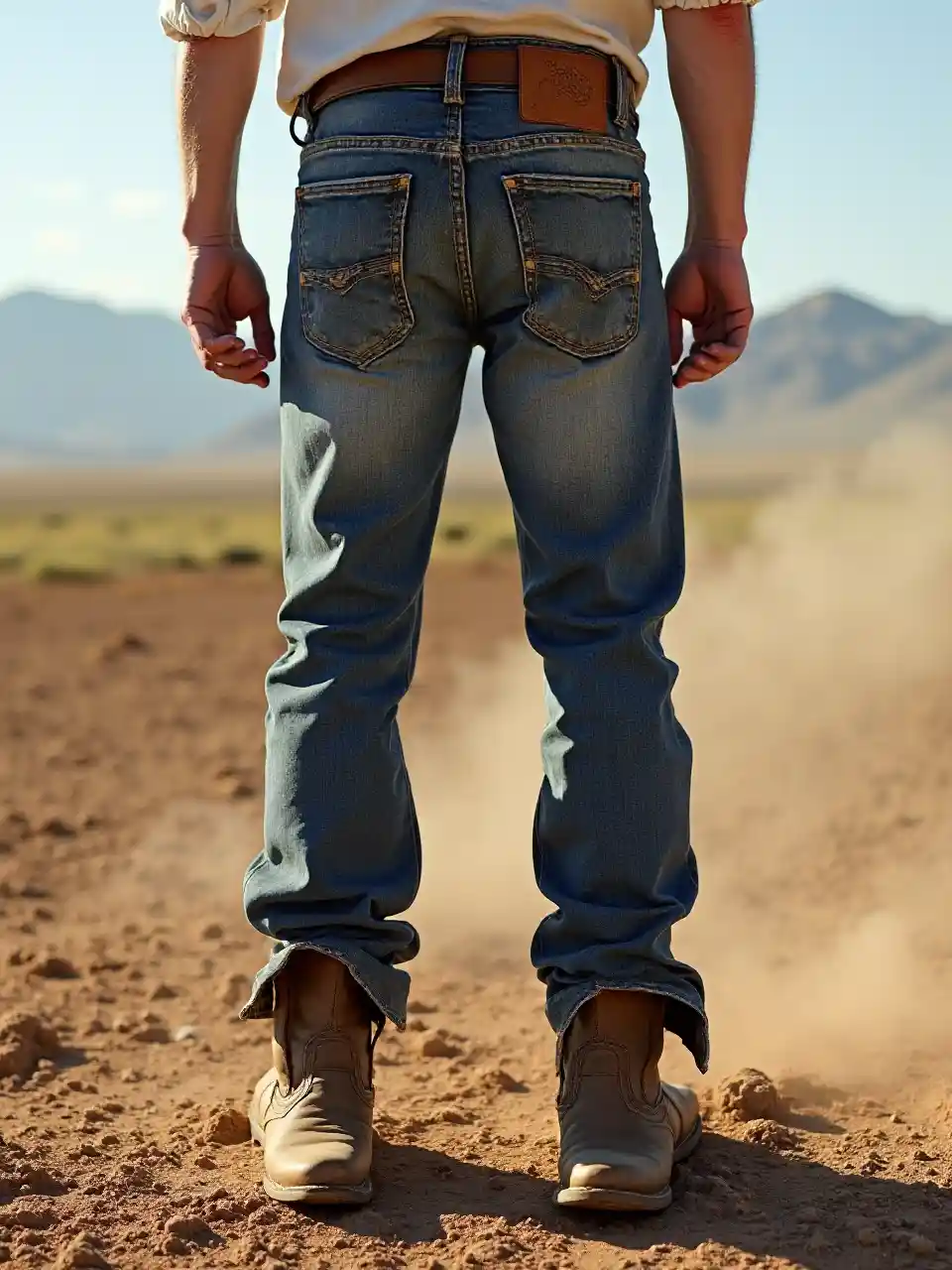@Q6GyA8ZLDotJZw32qeSv A male cowboy wearing rugged denim jeans that are slightly loose, draping over a pair of classic brown cowboy boots. He stands confidently in a dusty, sunlit landscape, with the golden rays casting long shadows. The background features a sprawling prairie with distant mountains under a clear blue sky. The camera captures a mid-shot angle, focusing on the cowboy's lower half, highlighting the boots peeking out from beneath the jeans. Dust swirls gently around his feet, adding a sense of movement to the tranquil scene, emphasizing the rugged, adventurous spirit of the cowboy lifestyle.