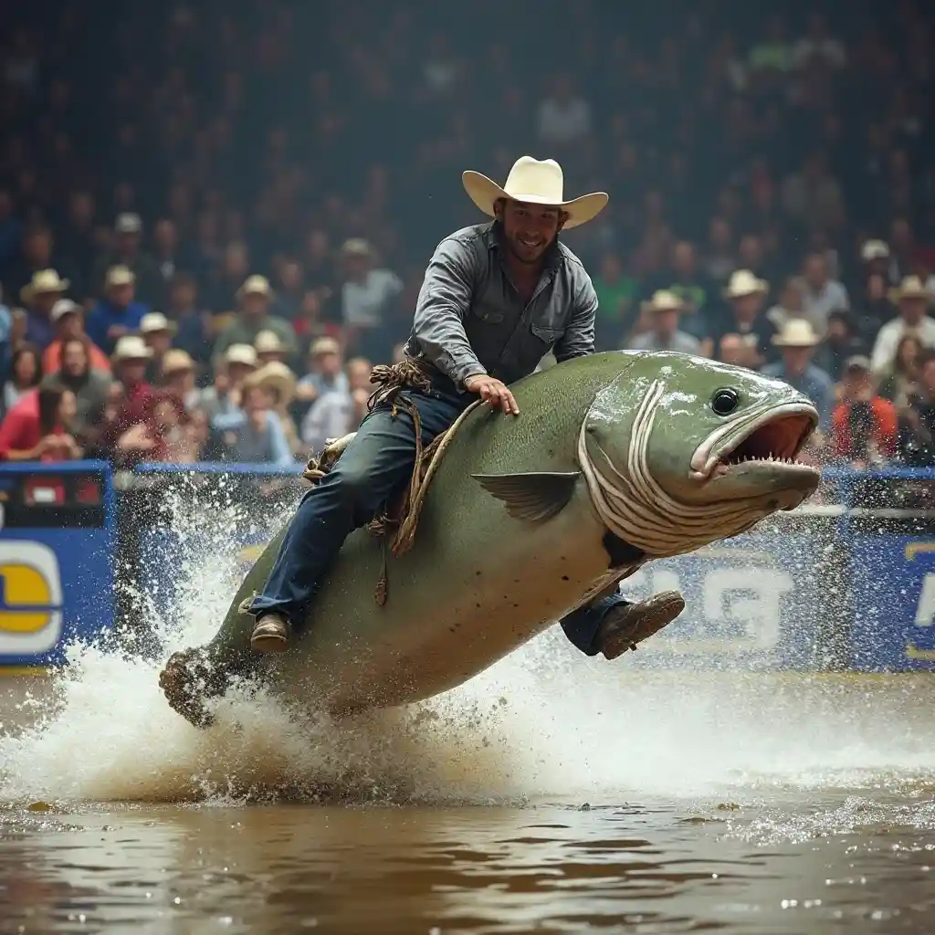 Spectacular Rodeo: Cowboy Rides Giant Fish in Arena