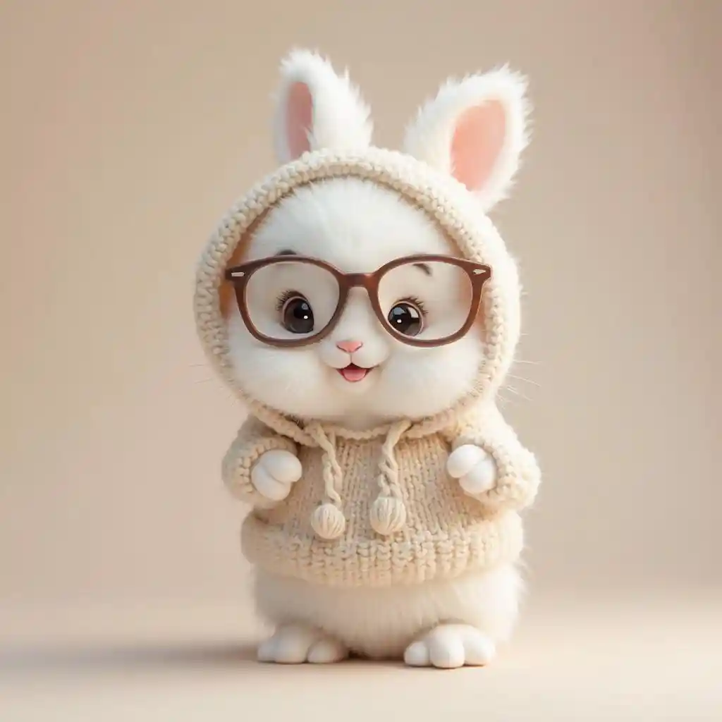 "A fluffy white bunny with big, round glasses and a cozy knit sweater. The bunny is standing on a smooth pastel surface, with its ears peeking out of the hoodie. Soft lighting creates a warm, adorable atmosphere, and the bunny has a sweet, curious expression."