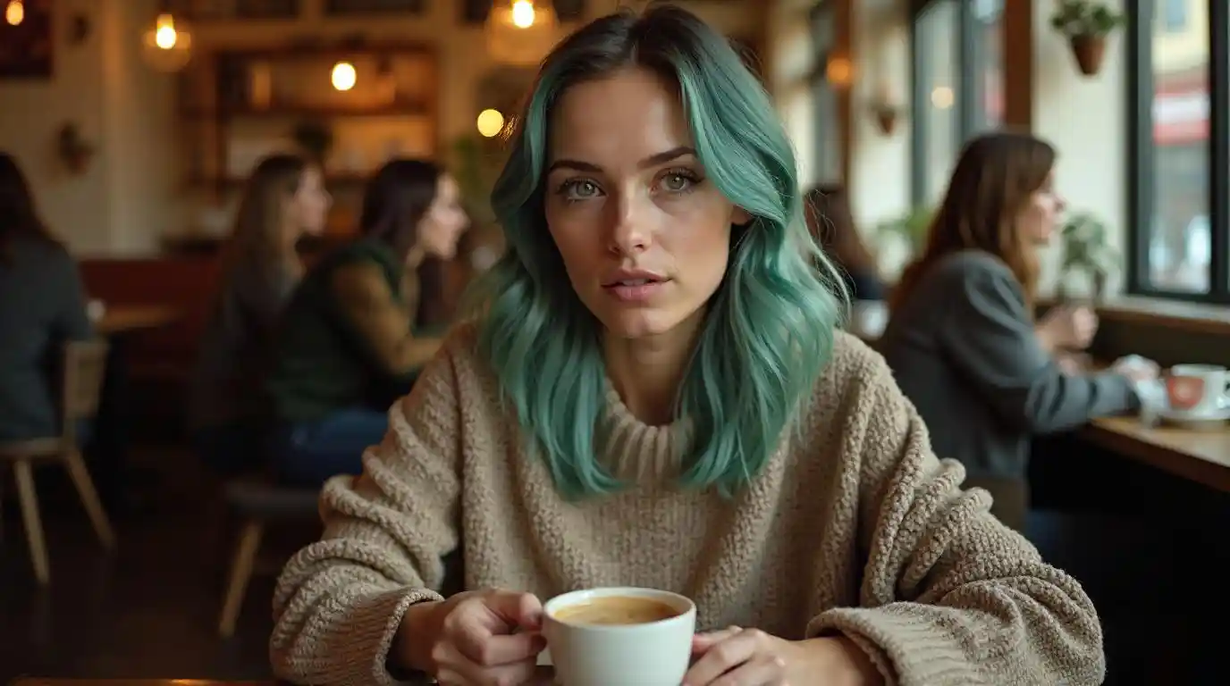 Autumn Coffee Shop with Teal-Haired Woman