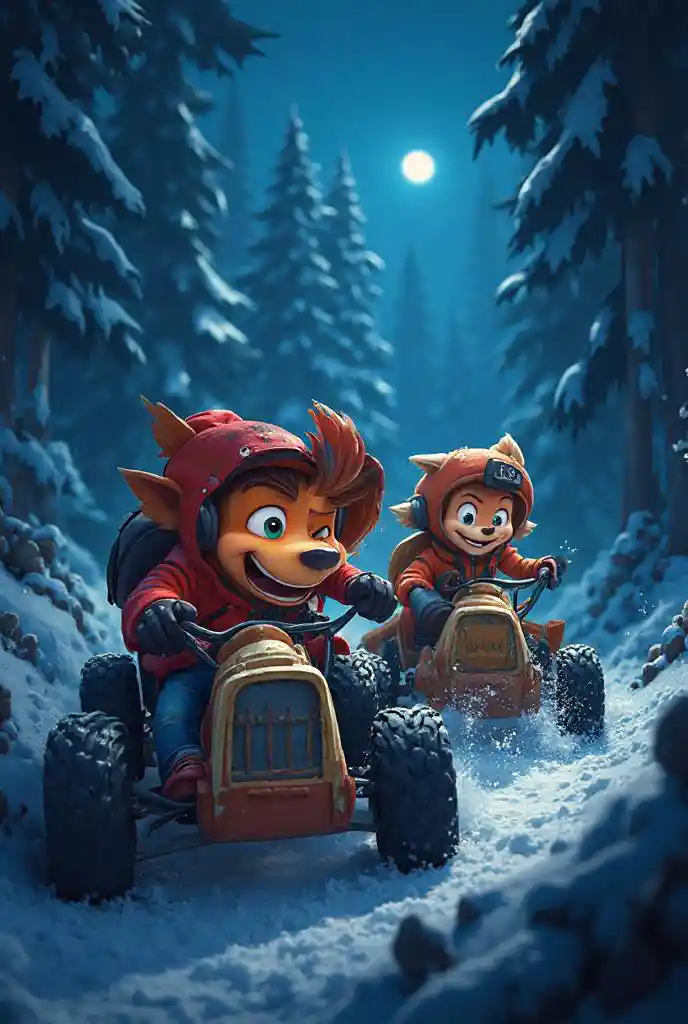 picture book, Crash bandicoot y polar team racing, fun, Feast in the woods at night,