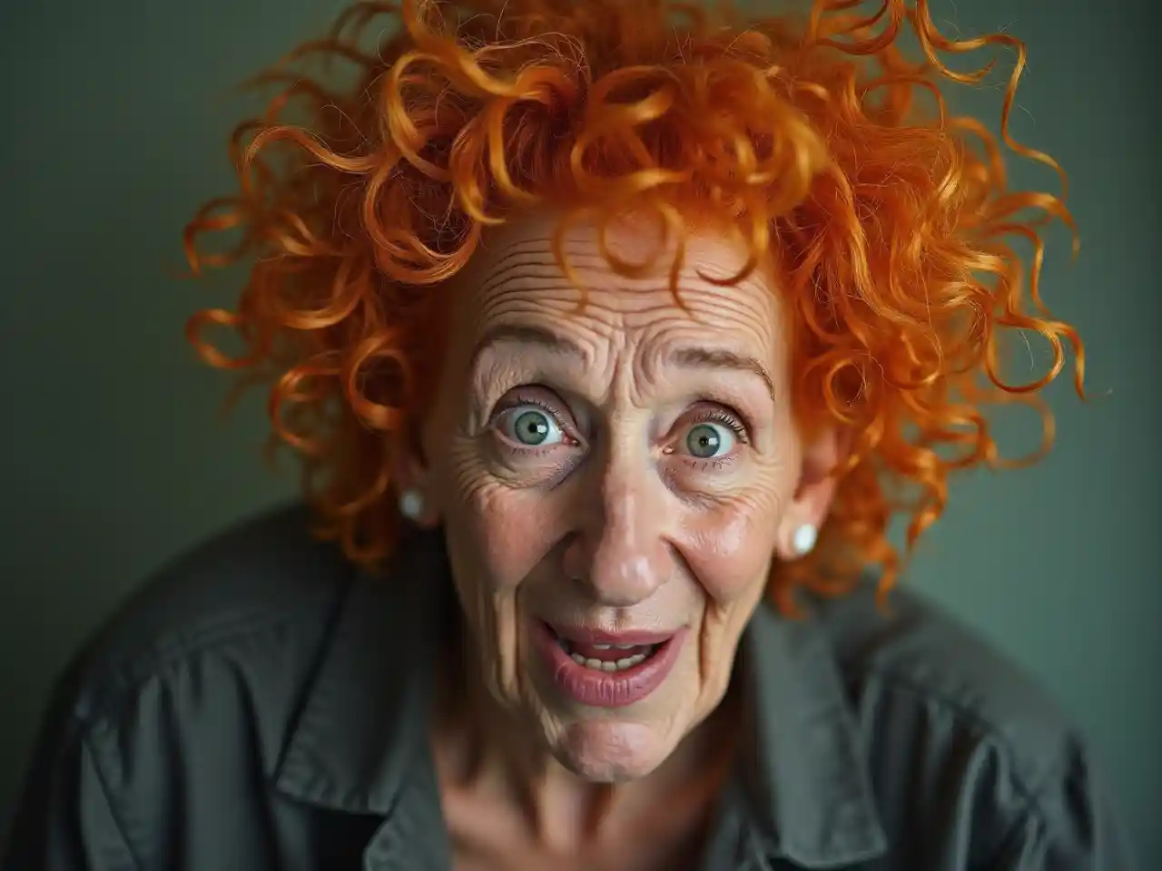 crazy old woman with curly orange hair