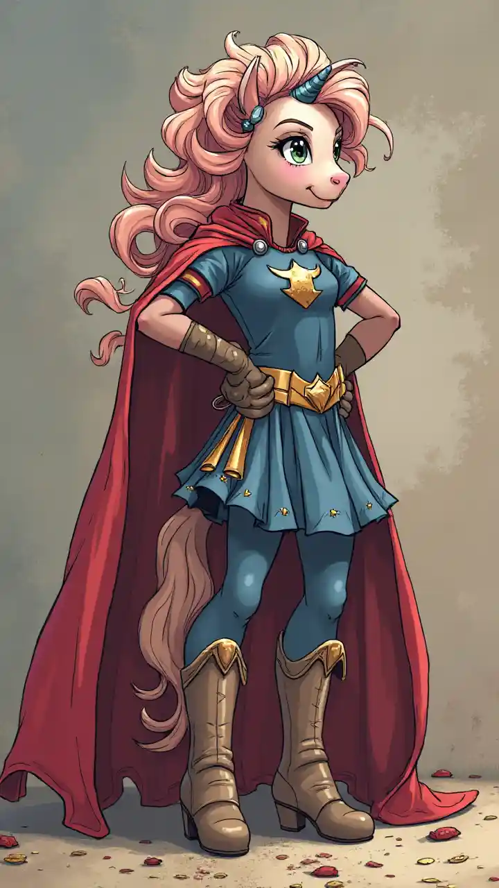 Pony superhero artist with a cape and with a creative attitude in a creative world