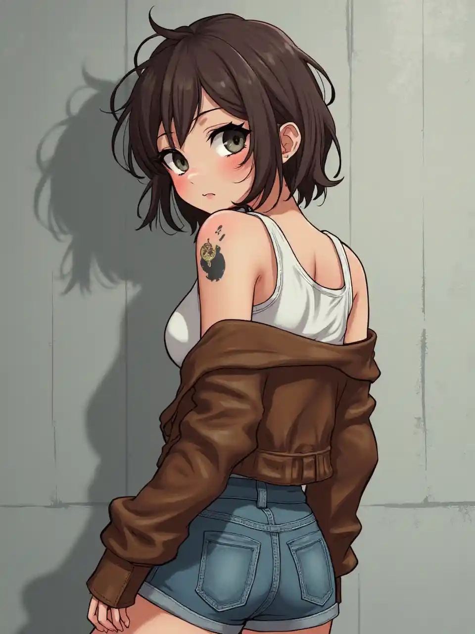 girl. droopy, big gray eyes. short brown hair. tattoo on her cheek with the shape of a crescent moon. wearing a white top and brown leather jacket. jeans mini shorts. Looking back. Big ass
