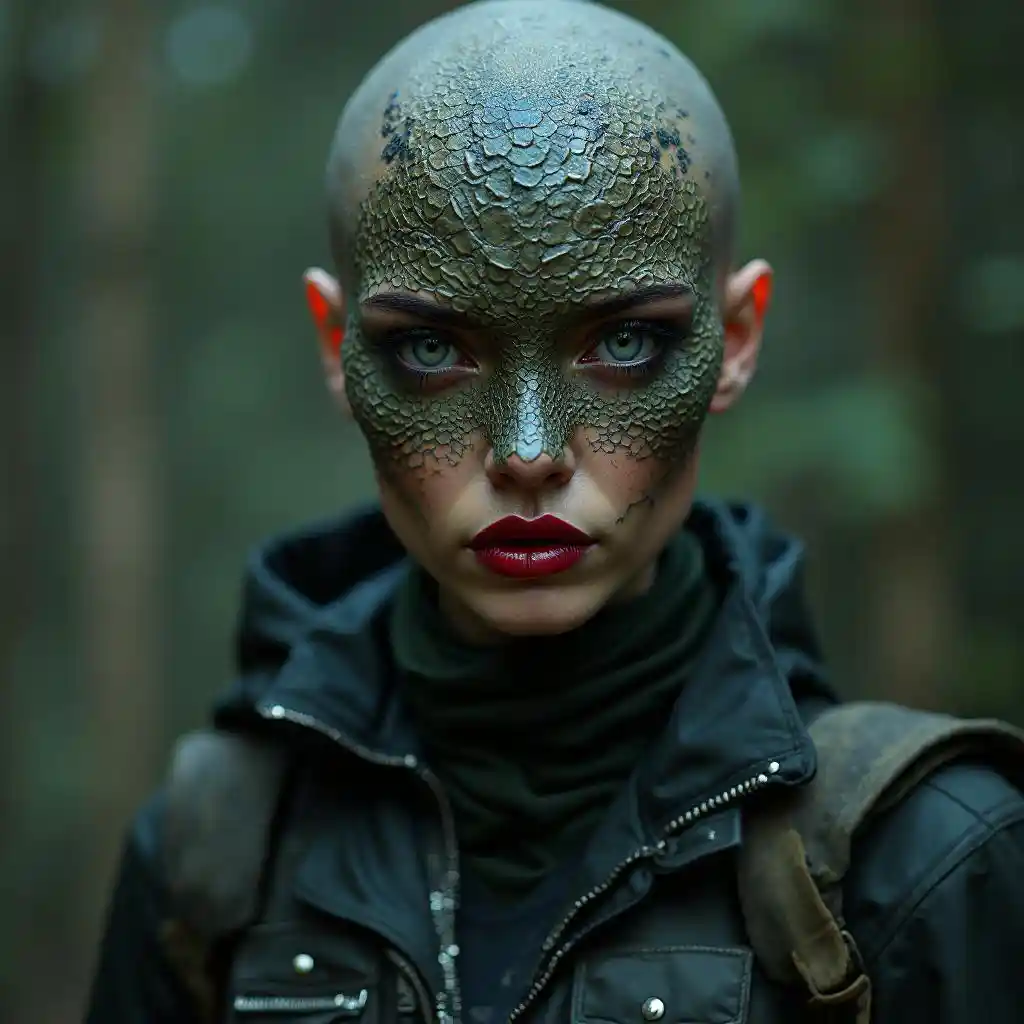 Bald Crocodile-Skin Woman in Combat Gear