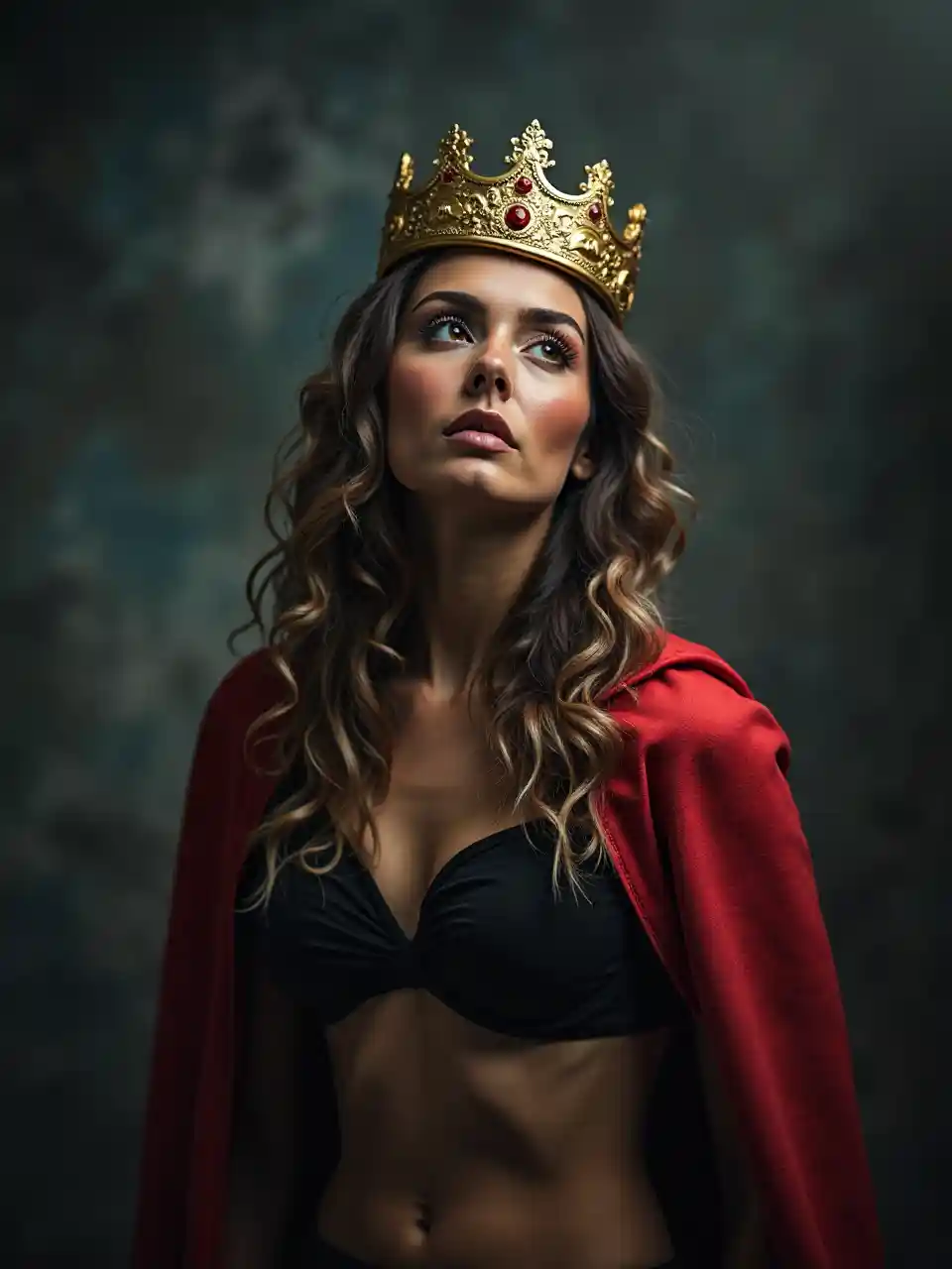 JaxonFighting looking woman with crown and cape looks up, dramatic lighting