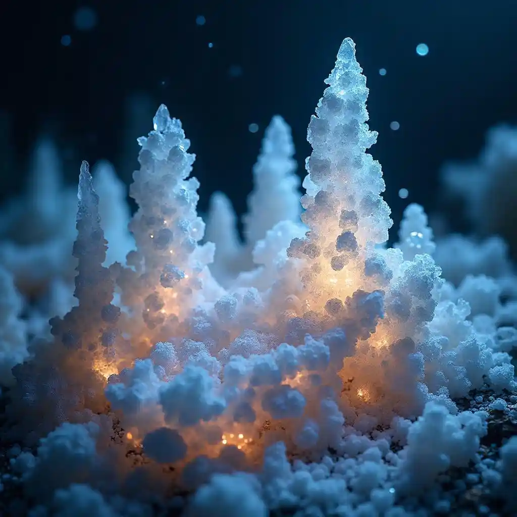 JackA microscopic fantasy world hidden inside a salt crystal, intricate crystalline structures forming glowing towers and bridges, bioluminescent fairy-like creatur