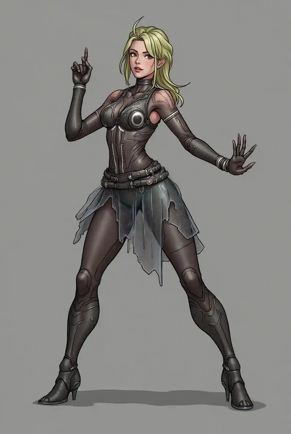 Scarlett1girl,Fighting. Combat stance.((Crystal material clothing)).skirt.translucent crystal. See-through.,A cyberpunk street fashion scene set in the year 3025. In a