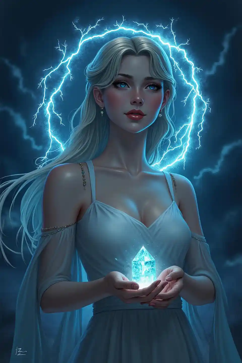 Luke(huge letter "2" in background:1.7), (Thundering stormy night background:1.7), female idol, beautiful woman, (Hand holding a shining crystal with the words “Sea