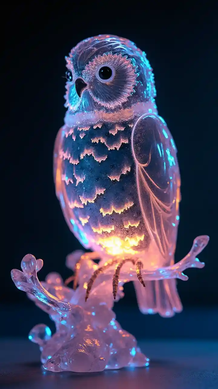 Une sculpture en cristal irisé d'un hibou majestueux, perchée sur une branche d'arbre en cristal, émettant une lueur bioluminescente douce et éthérée, entourée de particules de cristal étincelantes et vibrantes, reflétant la lumière comme des écailles irisées. La prise de vue macro, avec une mise au point ultra-nette, capture la texture moléculaire complexe du cristal et les rayons chatoyants qui dansent autour de la sculpture. L'aura éthérée et luminescente entoure la pièce, créant un effet de verre brisé avec des fragments cristallins nets et des reflets de couleurs vives. La photographie à grande vitesse saisit le mouvement dynamique et l'énergie de la sculpture, comme si elle était en train de prendre son envol. Inspirée par les styles de Ash Thorp, Simon Stalenhag et Syd Mead, avec une esthétique qui combine l'art du cristal, la bioluminescence et la photographie à grande vitesse.