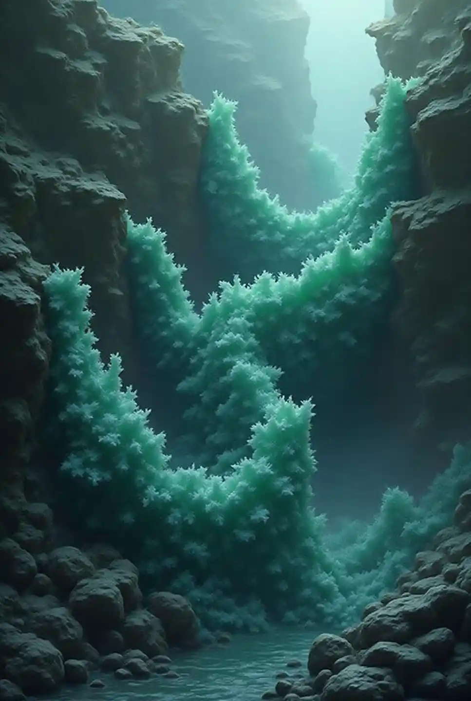 AsherDeformed dark green crystal, like a frozen sea wave, pours out, pours out to form two streams, spiraling. Rivers flow from the crystal frozen colors, crystal r