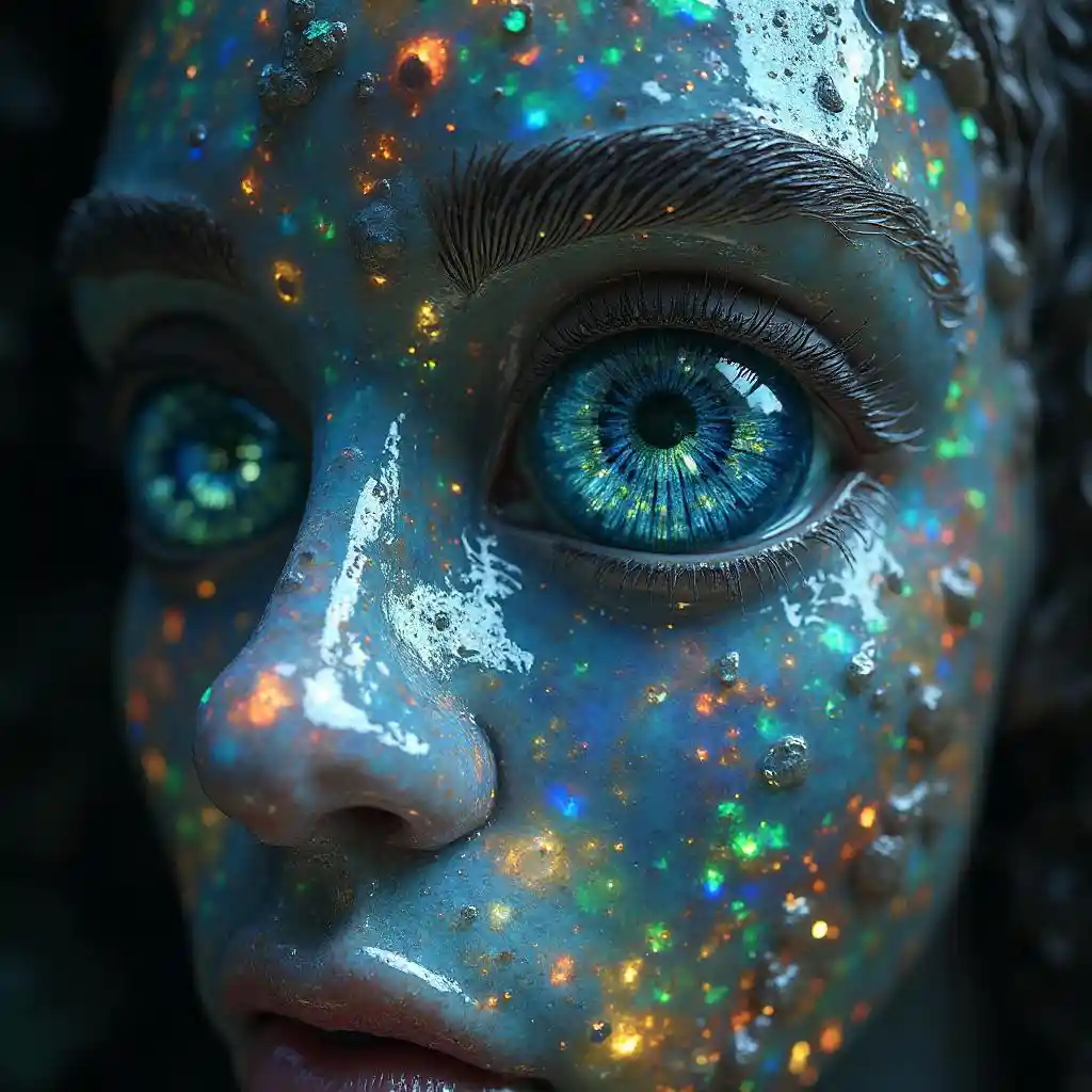 an extremely high quality octane render of a crystallised human eyes massive polished nose made of opal labradorite moldavite petalite specimen,glittering,highly detailed,highly polished,reflective,specular,complimentary colors,8 k,hd photo,reflections,shimmering,sharp edges,crisp,deep water colors