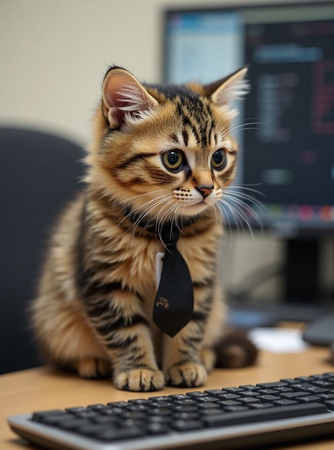 ChloeA cute office cat sitting on a desk, wearing a tiny tie and ID badge. The cat is a fluffy Scottish Fold with big round eyes, looking curiously at a computer