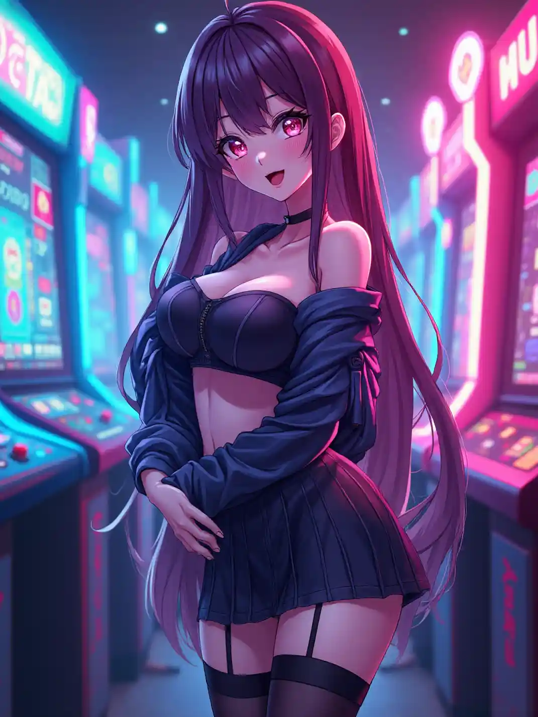 Vertical large-scale image of an Ultra HD anime girl, enchantingly beautiful and provocative, illuminated by neon lights, standing in a futuristic indoor gaming room with arcade machines, wearing a cyber JK uniform with a short skirt and thigh-high stockings, her long hair glowing with neon reflections and a playful smile, big shimmering eyes, glowing skin, neon pink and blue color palette, soft features, bold makeup, energetic and edgy vibes, dynamic lighting with a soft glow, accentuating her enticing, well-defined chest with a subtle cleavage, and long, toned legs with a confident stance, radiating charisma and allure.