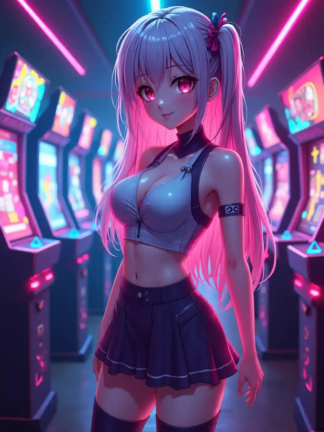 Vertical large-scale image of an Ultra HD anime girl, enchantingly beautiful and provocative, illuminated by neon lights, standing in a futuristic indoor gaming room with arcade machines, wearing a cyber JK uniform with a short skirt and thigh-high stockings, her long hair glowing with neon reflections and a playful smile, big shimmering eyes, glowing skin, neon pink and blue color palette, soft features, bold makeup, energetic and edgy vibes, dynamic lighting with a soft glow, accentuating her enticing, well-defined chest with a subtle cleavage, and long, toned legs with a confident stance, radiating charisma and allure.