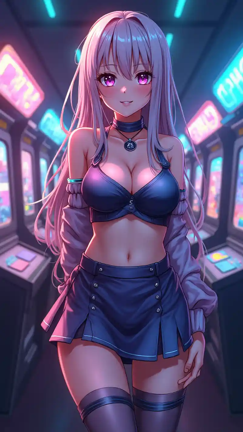Vertical large-scale image of an Ultra HD anime girl, enchantingly gorgeous and playful, illuminated by neon lights, standing in a futuristic indoor gaming room with arcade machines, wearing a cyber JK uniform with a short skirt and thigh-high stockings, her long hair glowing with neon reflections and a playful smile, big shimmering eyes, glowing skin, neon pink and blue color palette, soft features, bold makeup, energetic and edgy vibes, dynamic lighting with a soft glow, accentuating her charming, well-defined chest with a subtle cleavage, and long, toned legs with a confident stance, radiating charisma and allure.