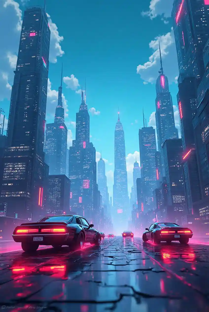 Futuristic Anime Cybernetic Skyline with Flying Cars