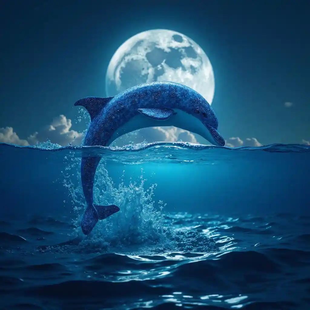 BettyA work that captures the majestic figure of 2 cyber dolphins, fully formed from the clear seawater, as vast and calm ocean leap out at full moon night. Their tr