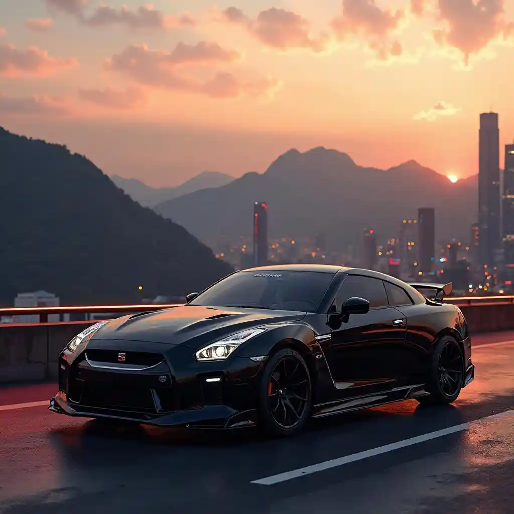 MackenzieNissan gtr r35 glossy black in cyberpunk neom city at evening sunset with great mountains on the background